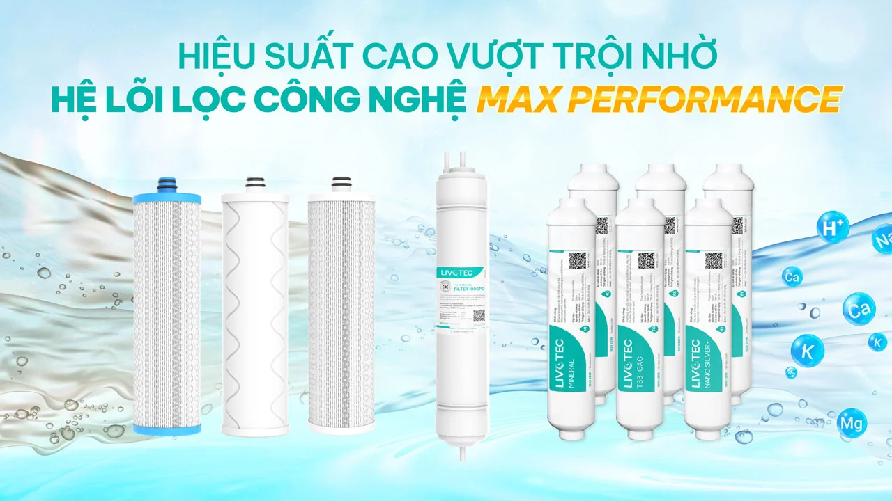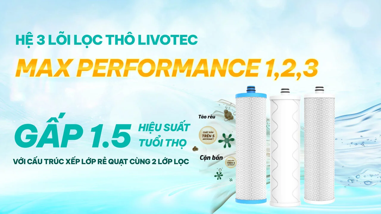 Hệ lõi lọc thô Livotec Max Performance 1,2,3 loại bỏ cặn bẩn có trong nước có kích thước trên 1 micron, khử hoàn toàn mùi khó chịu, chất hữu cơ… bảo vệ hệ lõi lọc hiệu quả, nâng cao tuổi thọ sử dụng. Với cấu trúc xếp lớp rẻ quạt và nhiều lớp lọc, hệ lõi lọc thô Max Performance còn giúp tăng gấp 1.5 hiệu suất lọc và 1.5 lần tuổi thọ, bảo vệ hiệu quả cho màng RO của sản phẩm.