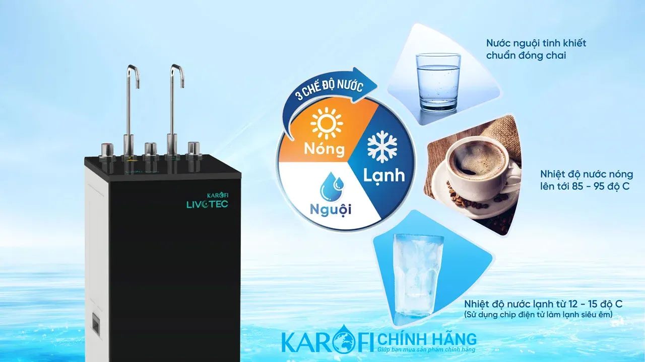 Máy lọc nước Karofi Livotec 612 nổi bật với thiết kế 2 vòi 3 chế độ lấy nước Nóng - Lạnh - Tinh khiết tiện lợi, đáp ứng mọi nhu cầu sử dụng nước của các thành viên trong gia đình. Công nghệ làm lạnh điện tử siêu êm mang đến nguồn nước mát dịu, dễ chịu phù hợp cho mọi người giải khát 4 mùa kể cả khi trời không quá nóng. Chức năng nước nóng tiện lợi giúp người dùng có thể thoải mái sử dụng pha trà, sữa, cafe, mì gói...