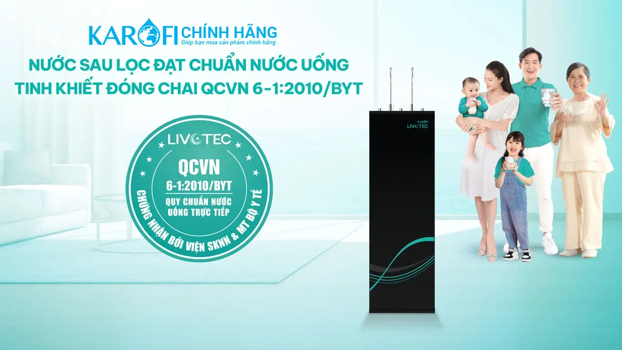Nguồn nước sau lọc từ máy lọc nước nóng lạnh Karofi Livotec 612 đạt chuẩn nước uống tinh khiết đóng chai QCVN 6-1:2010 theo quy trình của WHO do Viện Sức khỏe nghề nghiệp & Môi trường – Bộ Y Tế công nhận.