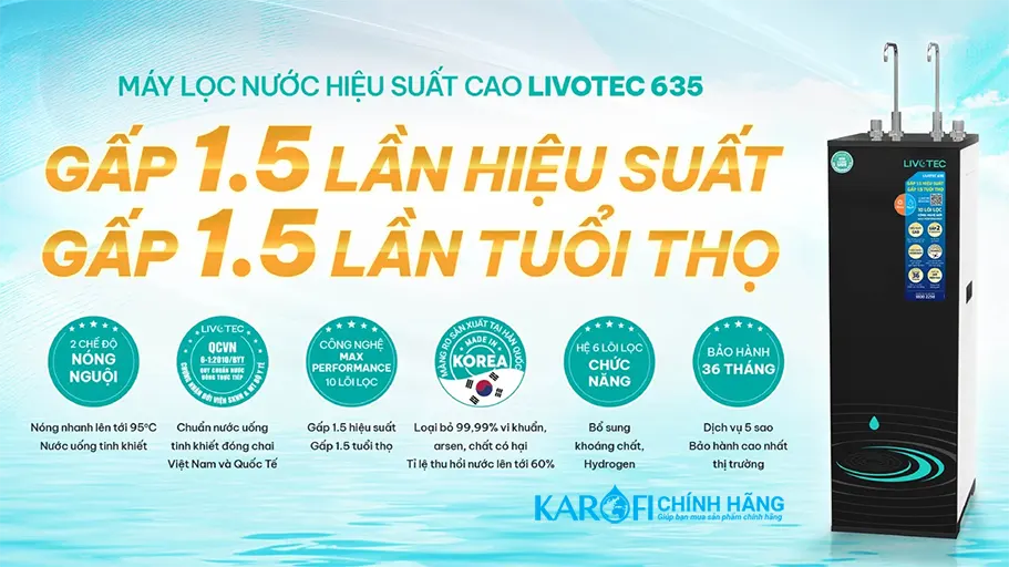 - Máy lọc nước Livotec 635 là giải pháp hoàn hảo cho nhu cầu sử dụng nước sạch và an toàn cho cả gia đình bạn. Với công nghệ lọc tiên tiến, sản phẩm này cam kết mang đến nguồn nước tinh khiết đạt tiêu chuẩn đóng chai, giúp bảo vệ sức khỏe và nâng cao chất lượng cuộc sống.