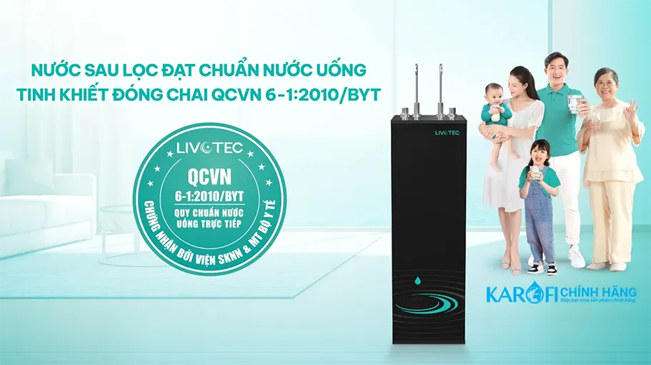 Nguồn nước sau lọc từ máy lọc nước hiệu suất cao Livotec 635 đạt chuẩn nước uống tinh khiết đóng chai QCVN 6-1:2010 BYT do Viện Sức khỏe nghề nghiệp & Môi trường - Bộ Y Tế công nhận.