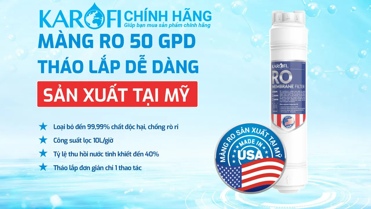 Màng RO 50 GPD (Mỹ): Công suất lọc 10 lít/giờ, tỷ lệ thu hồi nước tinh khiết 40%.