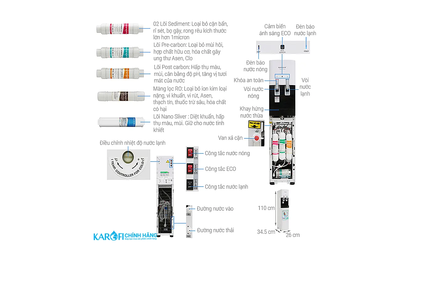 | 270x355x1100 | 6 cấp lọc | 15 lí/giờ | Bình nhựa siêu bền 5 lít |