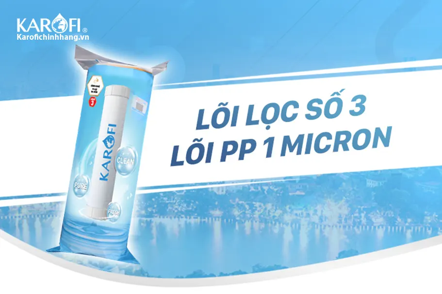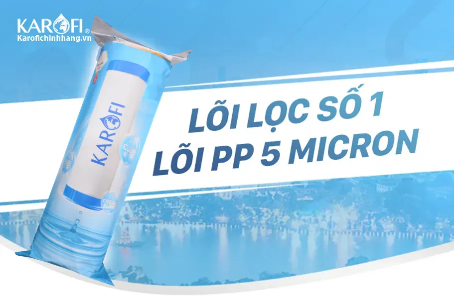 - Lõi số 1 của máy lọc nước Karofi được cấu tạo chủ yếu từ sợi bông xốp nhựa nguyên sinh PP, viết tắt của Polypropylene. Những sợi bông này được nén chặt lại với nhau, tạo ra các khe hở rất nhỏ chỉ 5 micron (khoảng 0,005mm).