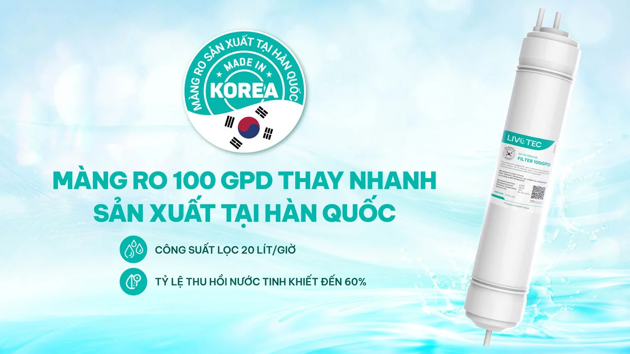 Màng lọc RO sản xuất tại Hàn Quốc cho công suất lọc lên đến 20 lít/giờ, tỷ lệ thu hồi nước tinh khiết lên đến 60%; đồng thời loại bỏ 99,99% virus, vi khuẩn, amip, asen, các ion kim loại và các chất độc hại trong nước.
