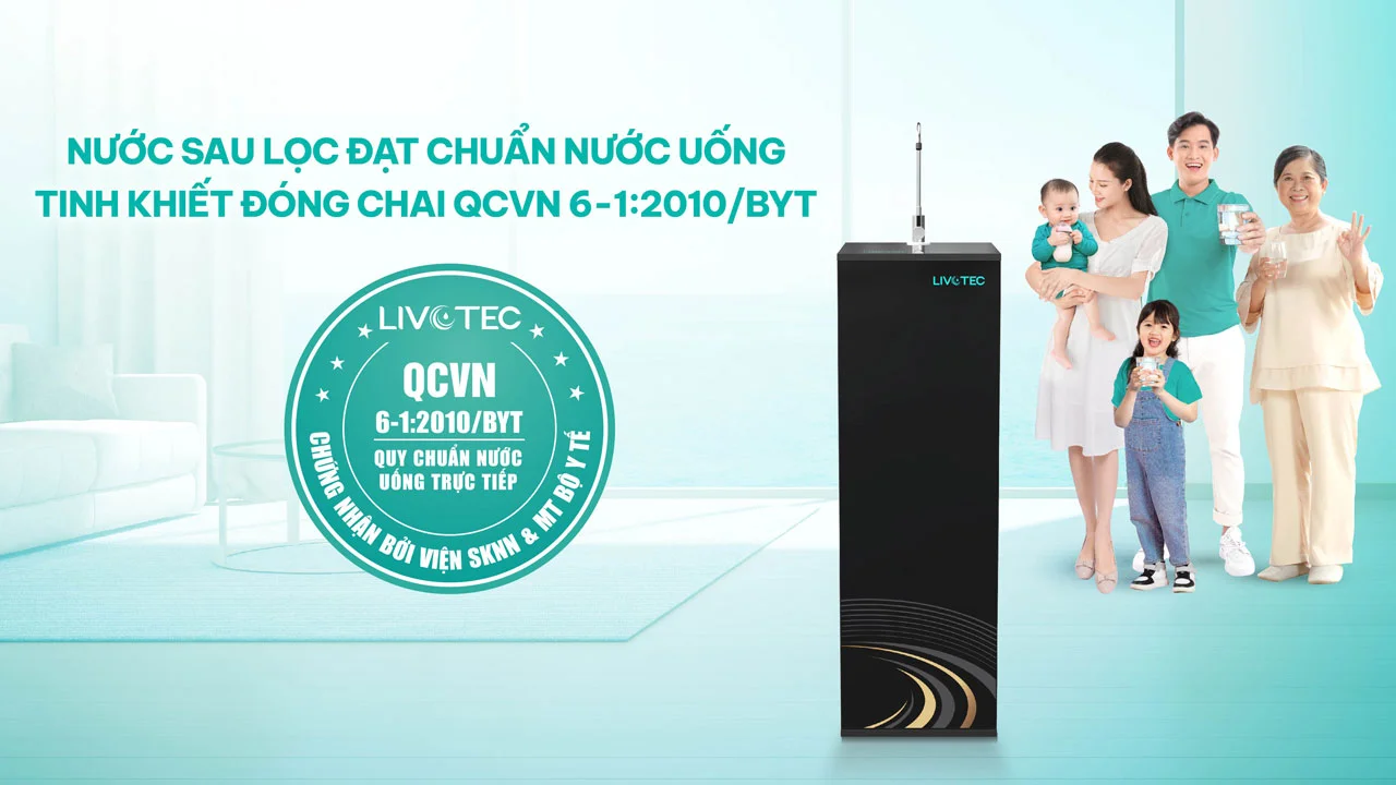 Nguồn nước sau lọc từ máy lọc nước hiệu suất cao Livotec 608 đạt chuẩn nước uống tinh khiết đóng chai QCVN 6-1:2010 BYT do Viện Sức khỏe nghề nghiệp & Môi trường – Bộ Y Tế công nhận.