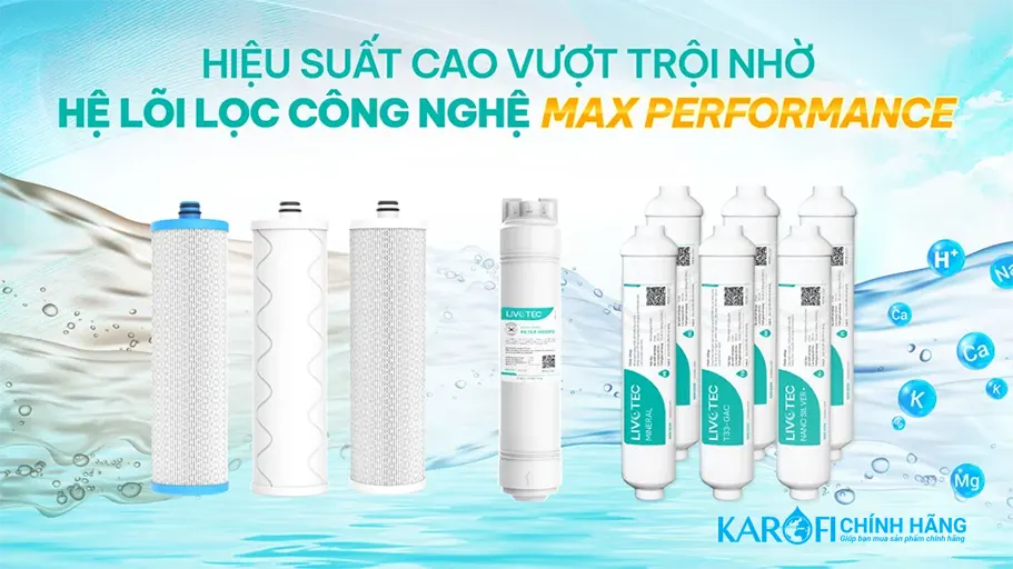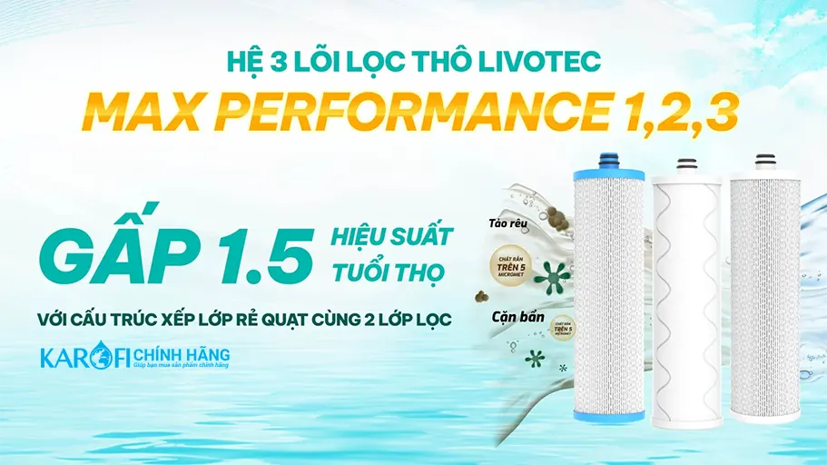 - Hệ lõi lọc thô Livotec Max Performance 1,2,3 loại bỏ cặn bẩn có trong nước có kích thước trên 1 micron, khử hoàn toàn mùi khó chịu, chất hữu cơ… bảo vệ hệ lõi lọc hiệu quả, nâng cao tuổi thọ sử dụng. Với cấu trúc xếp lớp rẻ quạt và nhiều lớp lọc, hệ lõi lọc thô Max Performance còn giúp tăng gấp 1.5 hiệu suất lọc và 1.5 lần tuổi thọ, bảo vệ hiệu quả cho màng RO của sản phẩm.