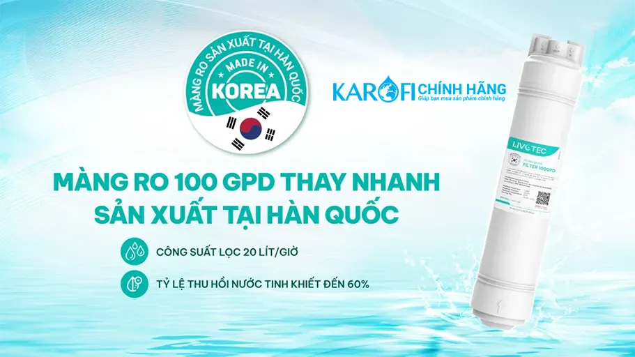 Màng lọc RO sản xuất tại Hàn Quốc cho công suất lọc lên đến 20 lít/giờ, tỷ lệ thu hồi nước tinh khiết lên đến 60%; đồng thời loại bỏ 99,99% virus, vi khuẩn, amip, asen, các ion kim loại và các chất độc hại trong nước.