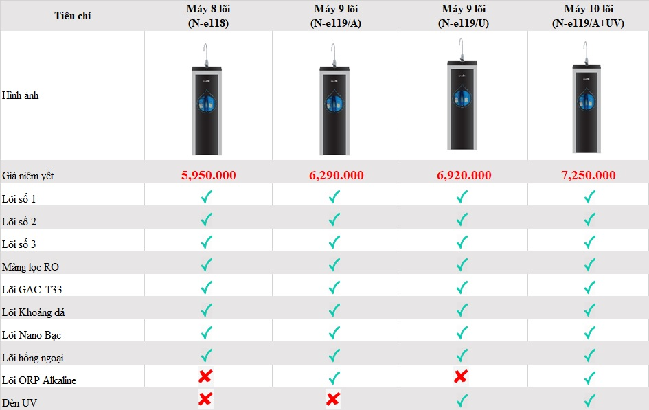 SO SÁNH MÁY LỌC NƯỚC TIÊU CHUẨN KAROFI N-E119/A VỚI N-E119/U, N-E119/A +UV, N-E118