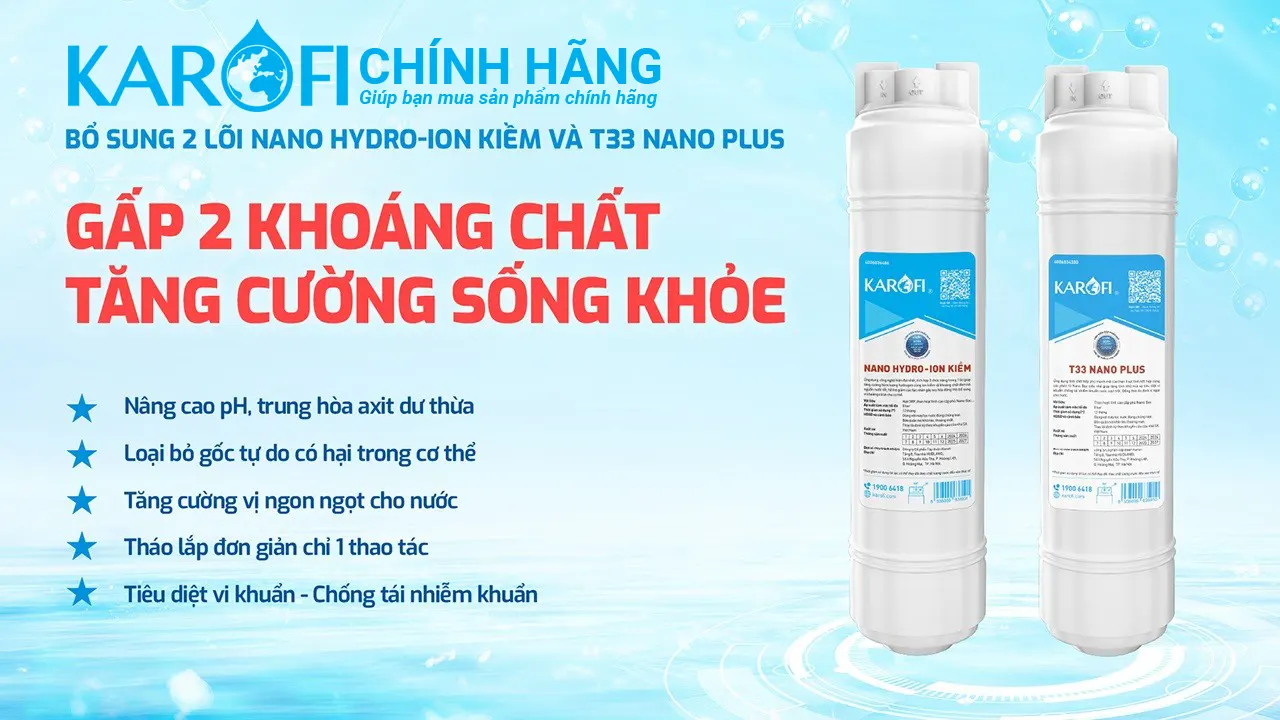 Lõi T33 Nano Plus & Nano Hydro-ion kiềm: Bổ sung Hydrogen, ion kiềm và khoáng chất, hỗ trợ tiêu diệt vi khuẩn, giúp nước ngon hơn và tốt hơn cho sức khỏe.