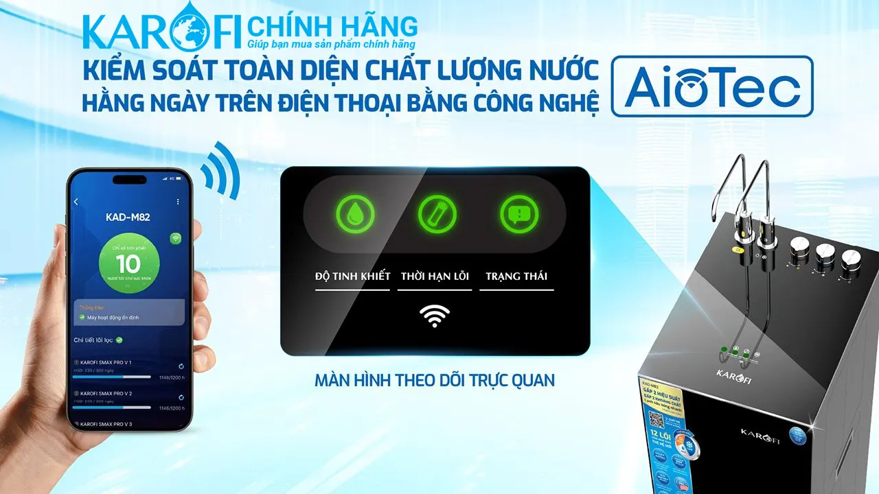 AioTec: Giám sát chất lượng nước từ xa qua điện thoại, cảnh báo thay lõi, kích hoạt bảo hành dễ dàng.