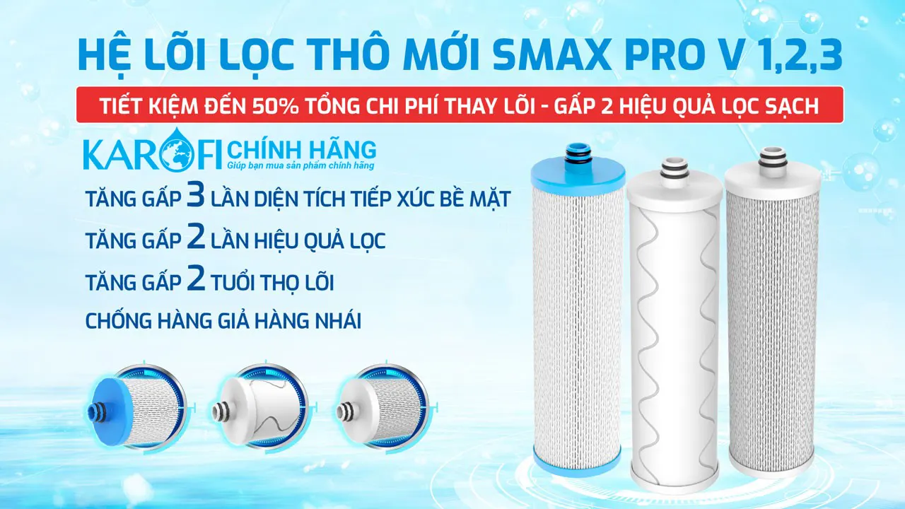 Bộ 3 lõi lọc thô Smax Pro V: Công nghệ Smart Connect chống hàng giả, cấu trúc rẻ quạt thông minh tăng diện tích tiếp xúc nước gấp 3 lần.